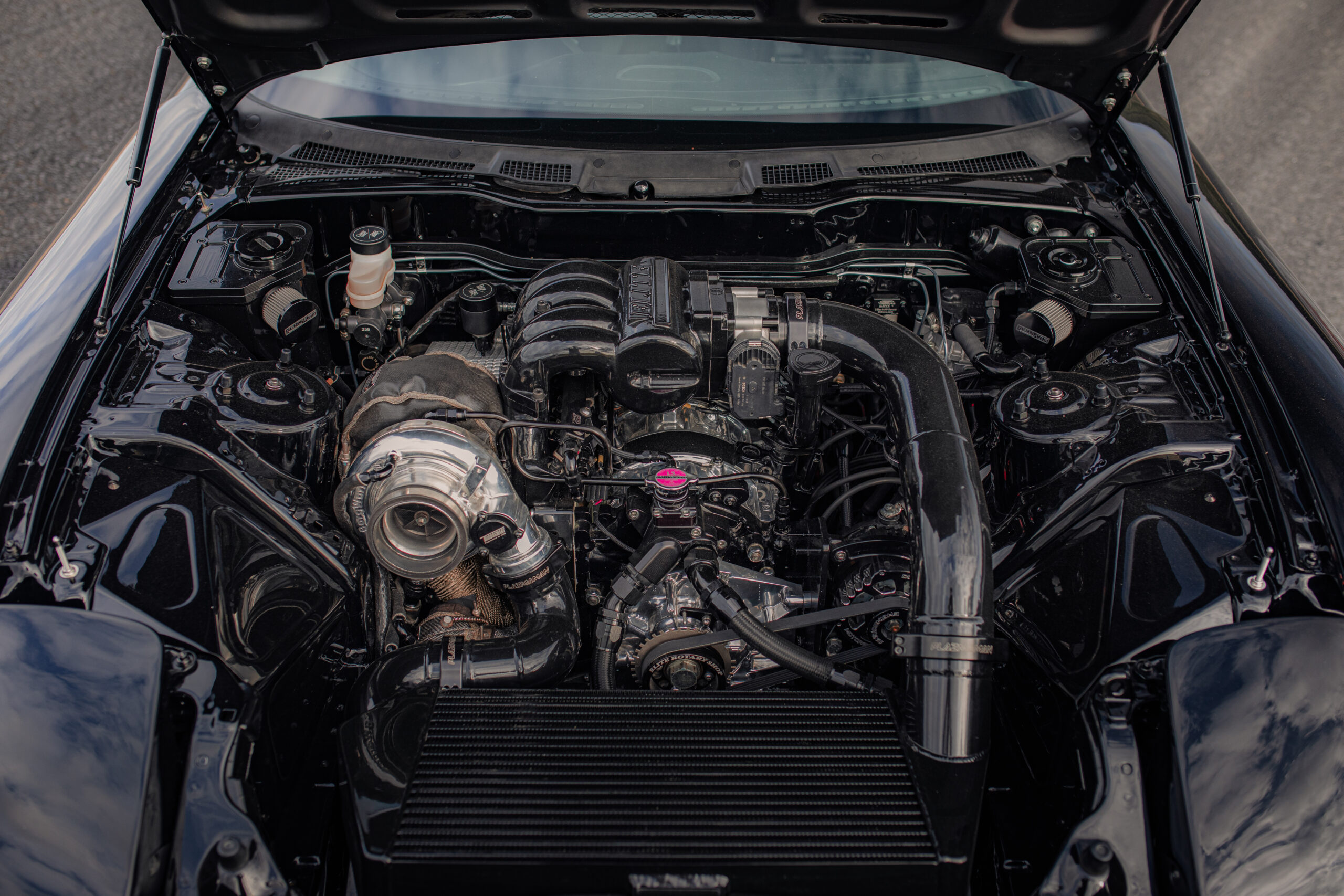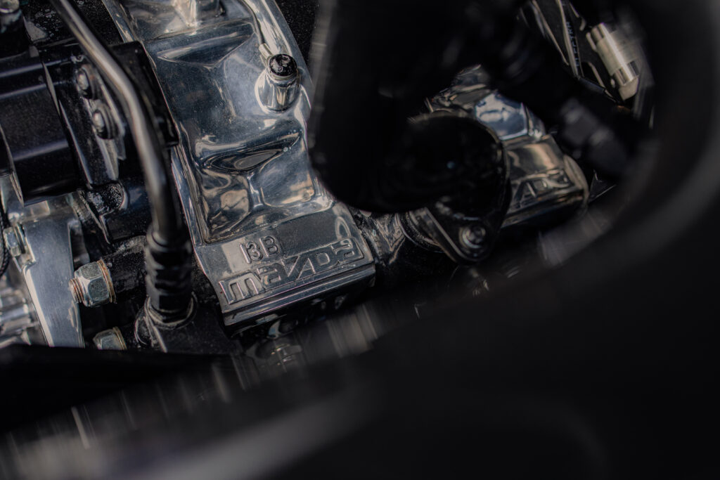 Detail was once again at the forefront. Polished housings and front cover, shaved plates drenched in black paint conceal series-4 side clearanced and lightened rotors kitted with SCR apex seals, the whole rotating assembly balanced on a Precision eccentric shaft.