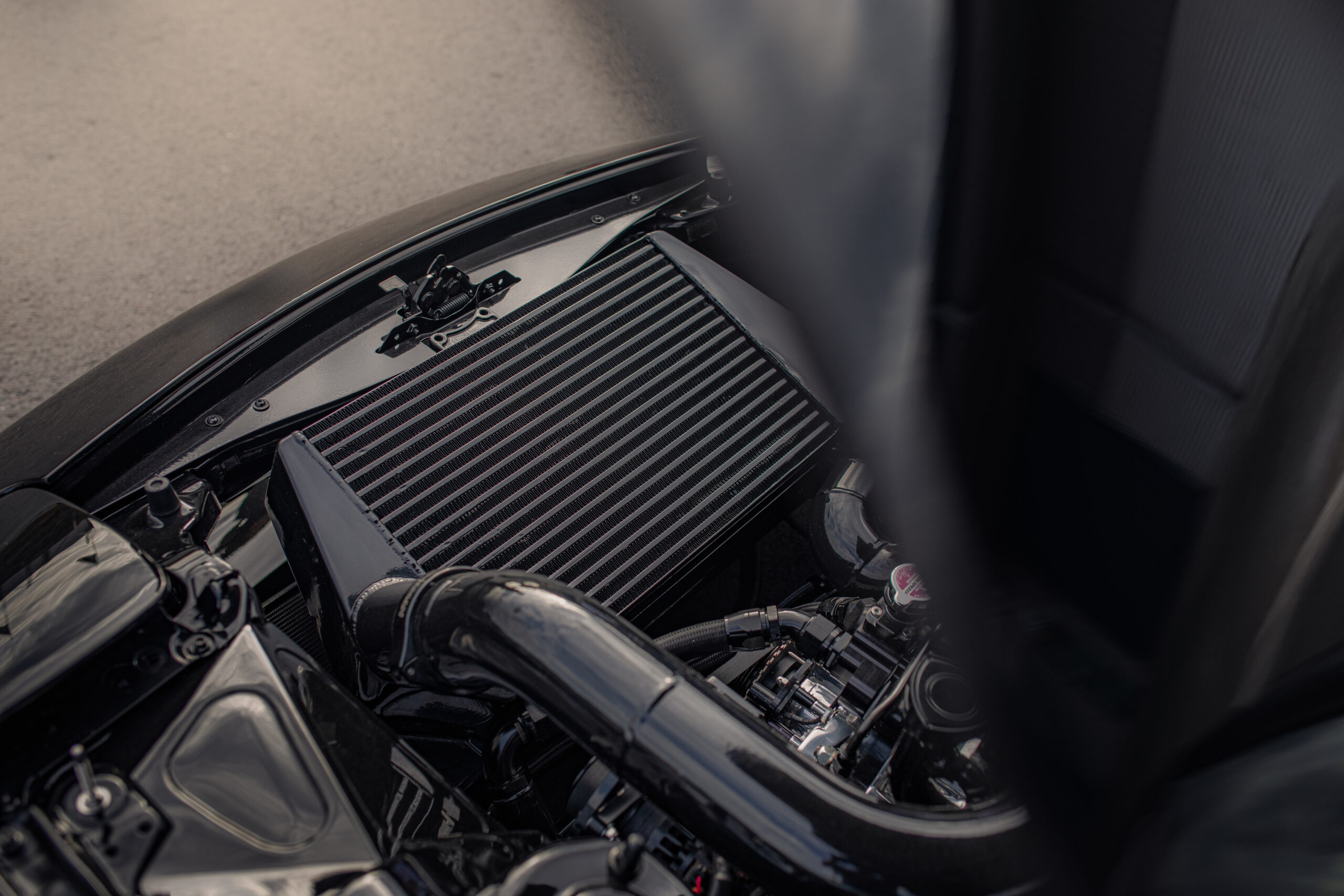 COOLING: Custom V-mount radiator with PWR advanced cooling technology core, custom V-mount intercooler with PWR advanced cooling technology core, twin SPAL fans, dual Setrab 19-row oil cooler kits, SakeBomb Garage Smart Cooler oil thermostats, Davies Craig electric water pump