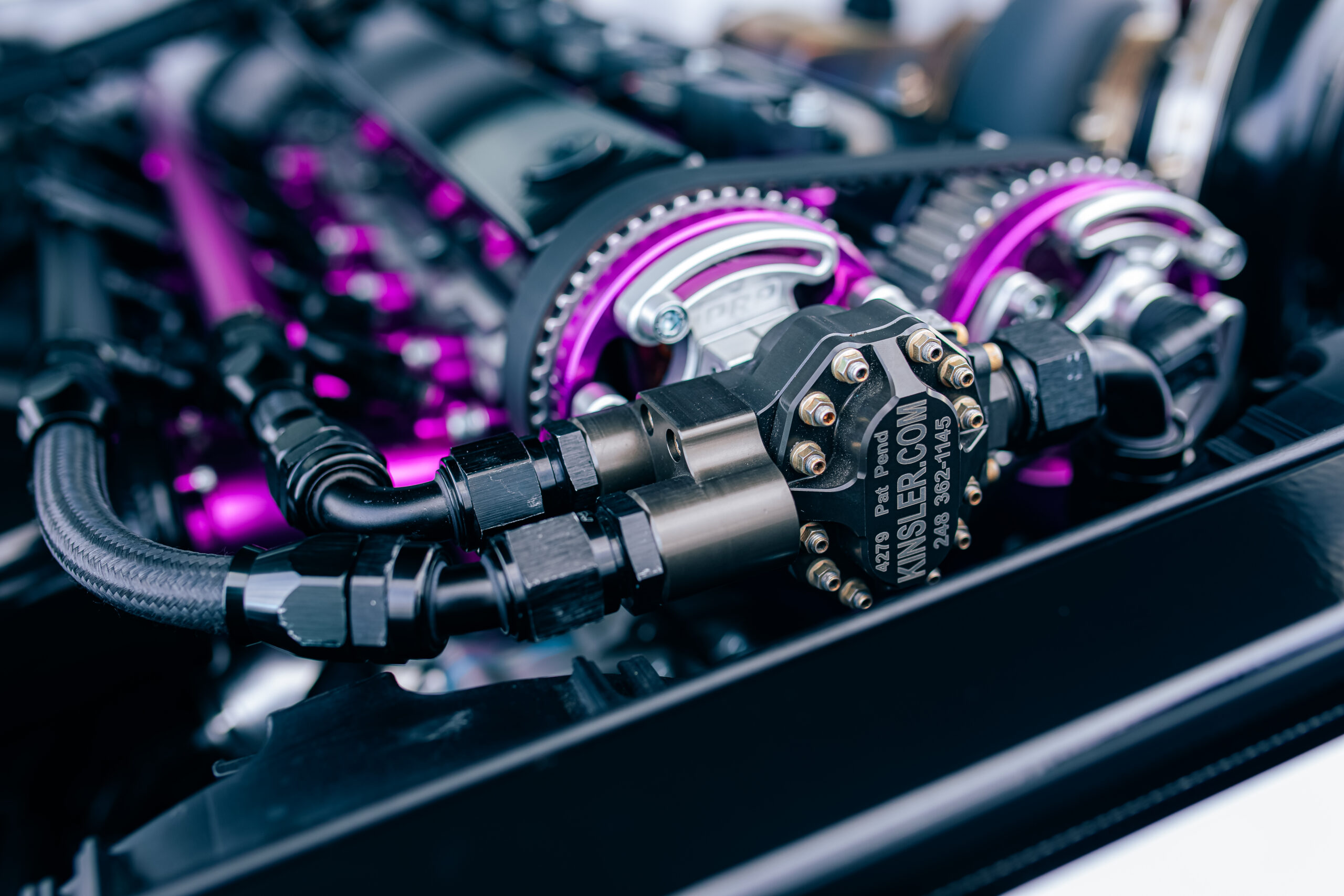 FUEL: 700 Series Kinsler mechanical pump, twin Hypertune fuel rails, twin 1650cc Bosch injectors, custom surge tank, Teflon lines, flex fuel sensor, Turbosmart fuel pressure regulator