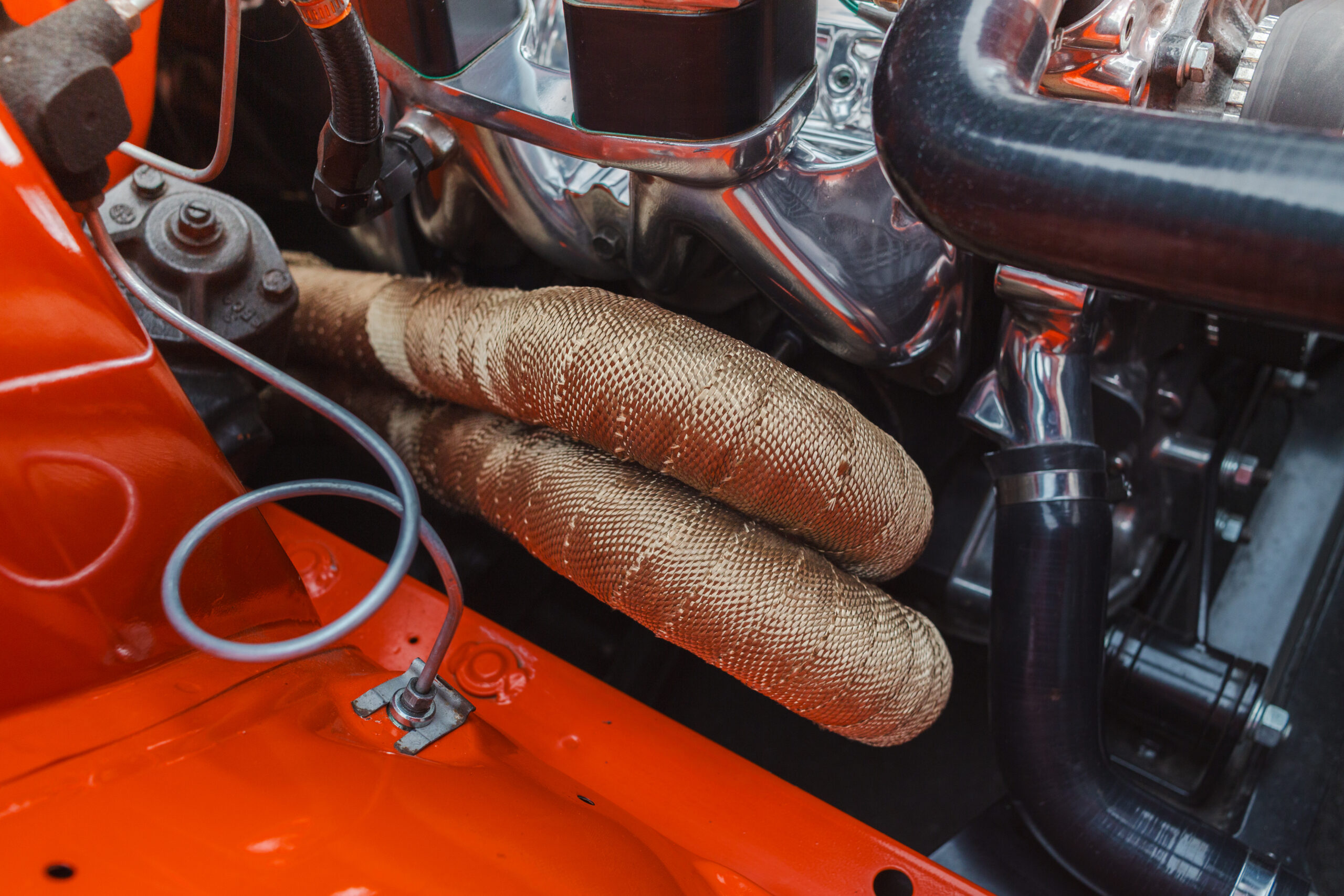 EXHAUST: Full custom mild steel tuned-length headers, twin two-inch system merging into a single 2.5-inch pipe, rotary boiler muffler